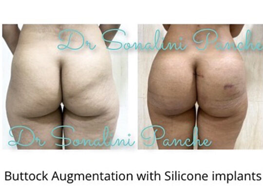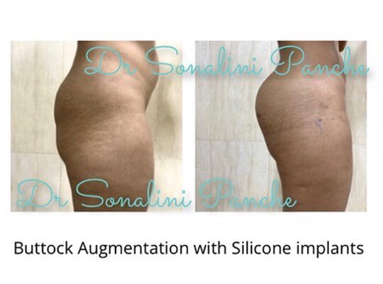 During the buttock augmentation procedure using silicone implants, the surgeon makes incision in the natal cleft (crease between two buttock cheeks) where the scars are well hidden. The size and shape of the silicone implants are chosen based on the patient’s desired outcome and body proportions. The implants are carefully placed within or above the gluteal muscle, depending on the surgeon’s technique and the patient’s anatomy. Once the implants are in place, the incisions are closed with sutures.